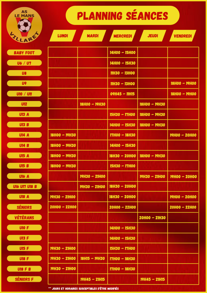 L’organigramme sportif / Le planning des séances